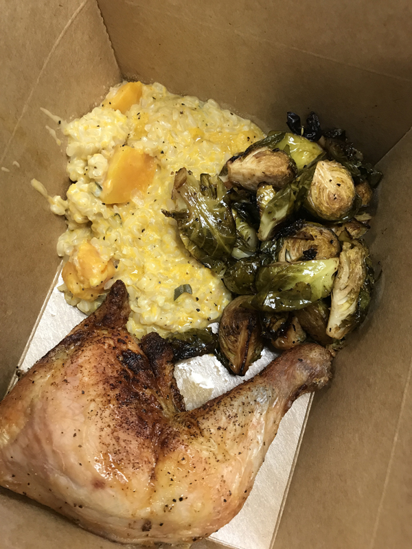Roast Chicken served on a bed of potato gnocchi with spinach, cannellini beans, tomatoes, and Italian herbs and spices.
