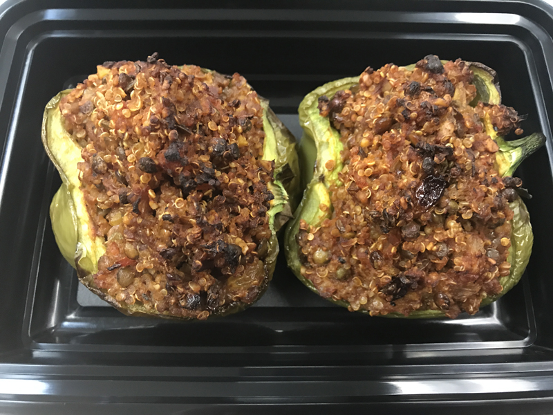 Quinoa bowl with roasted butternut squash, beets, Brussels sprouts, herbs, and spices. Vegan with the option to add fish or chicken. Gluten-free.